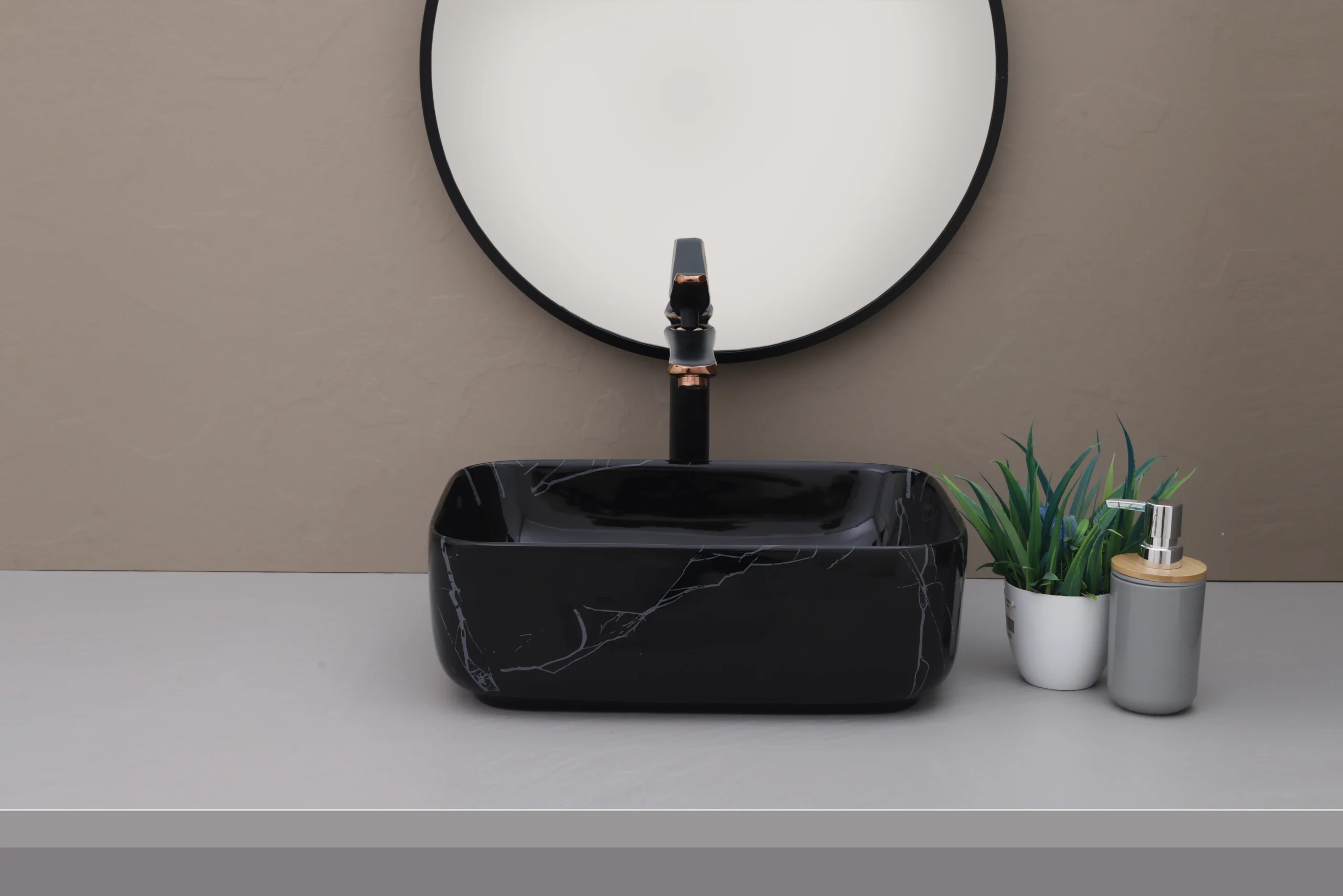A sleek, high-gloss black finish accented by delicate white marbling for ultimate modern sophistication.