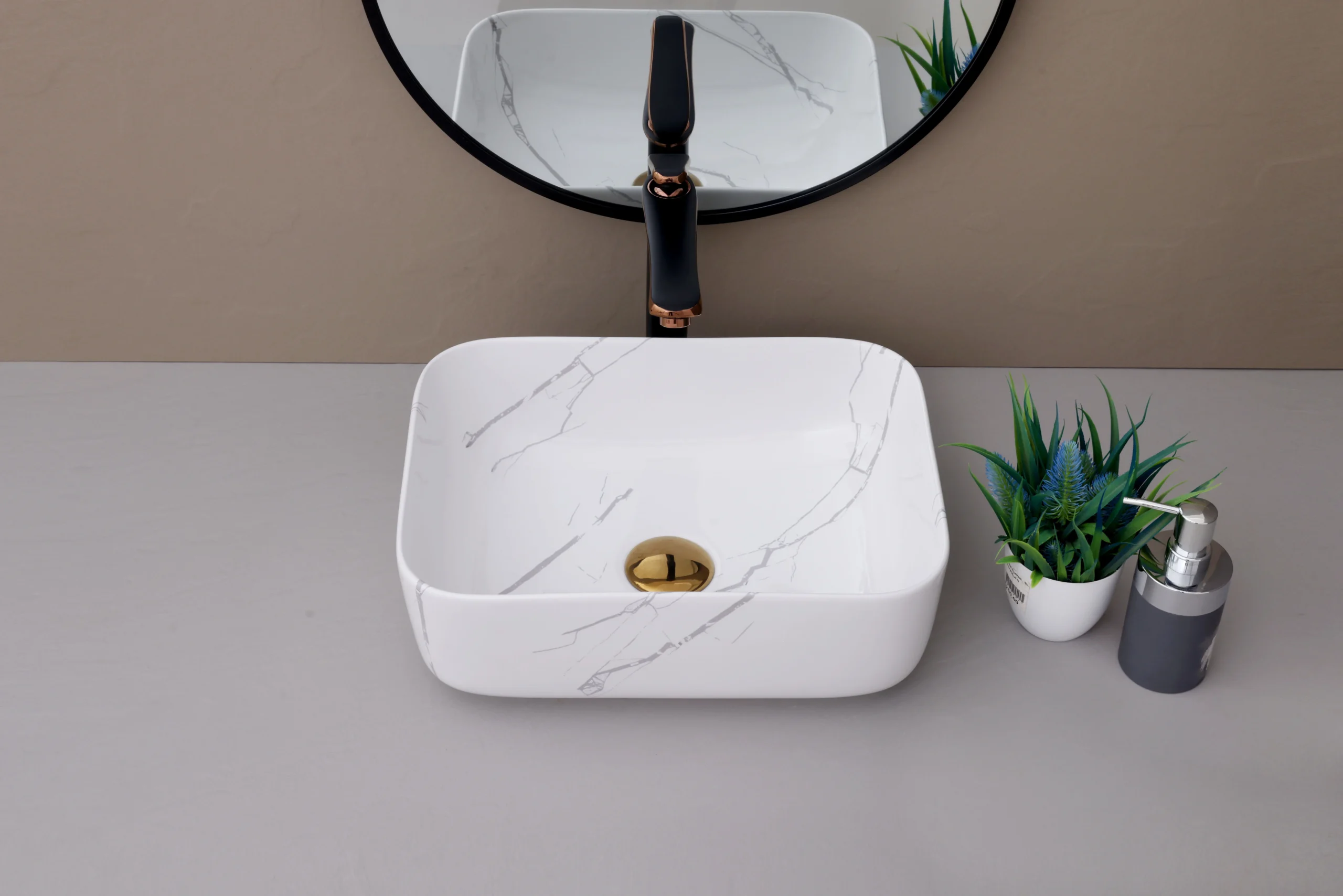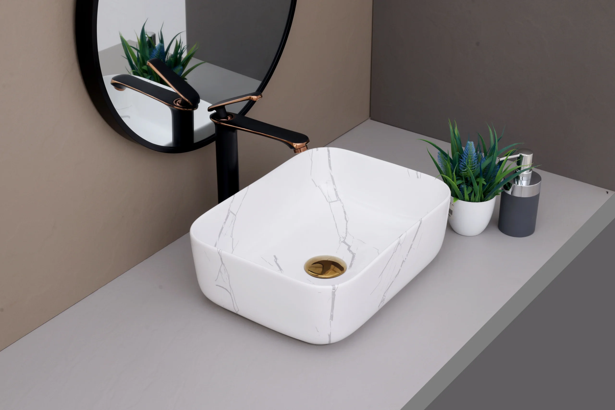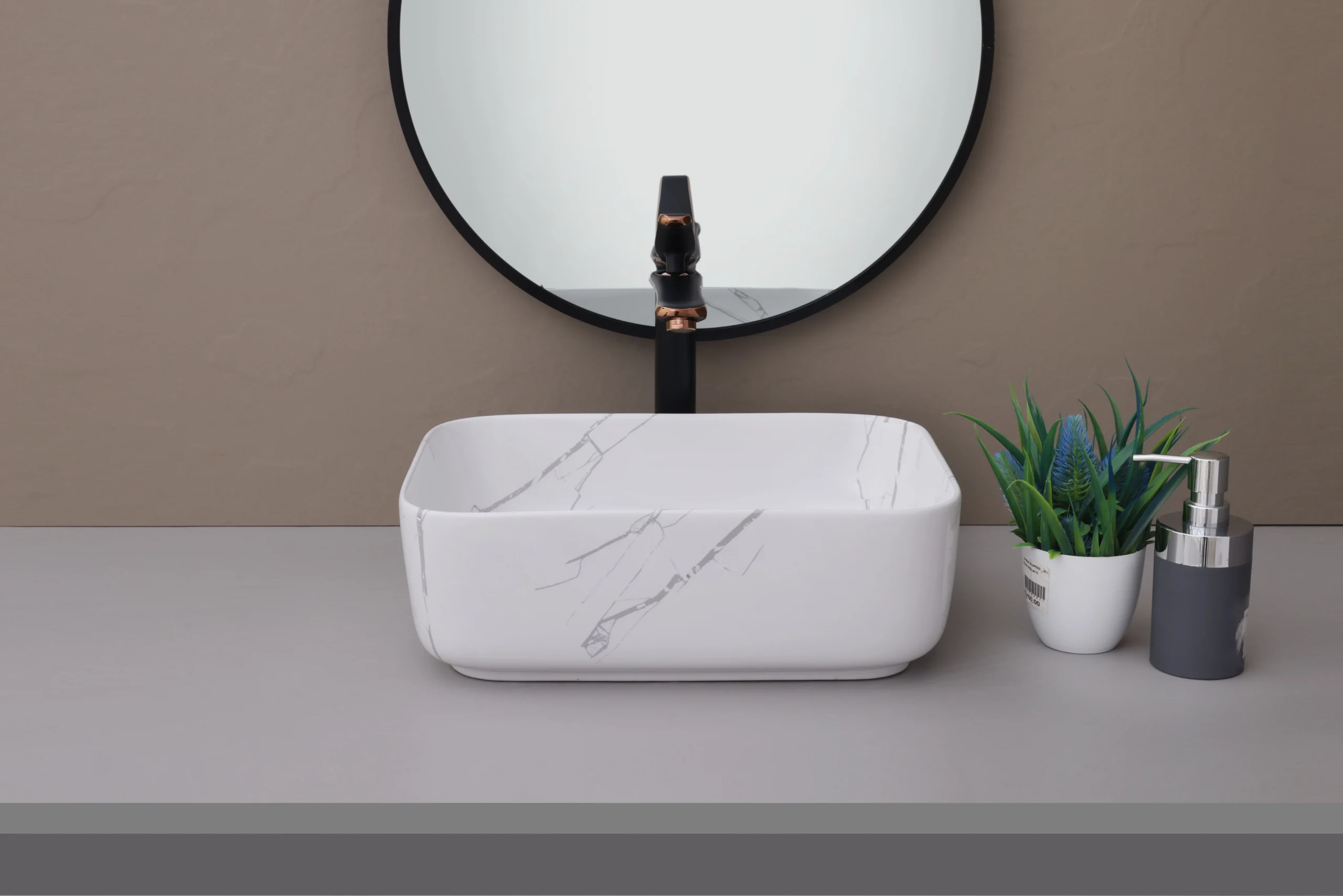 Our Marble-Pattern Vessel Sink blends organic textures with modern precision.