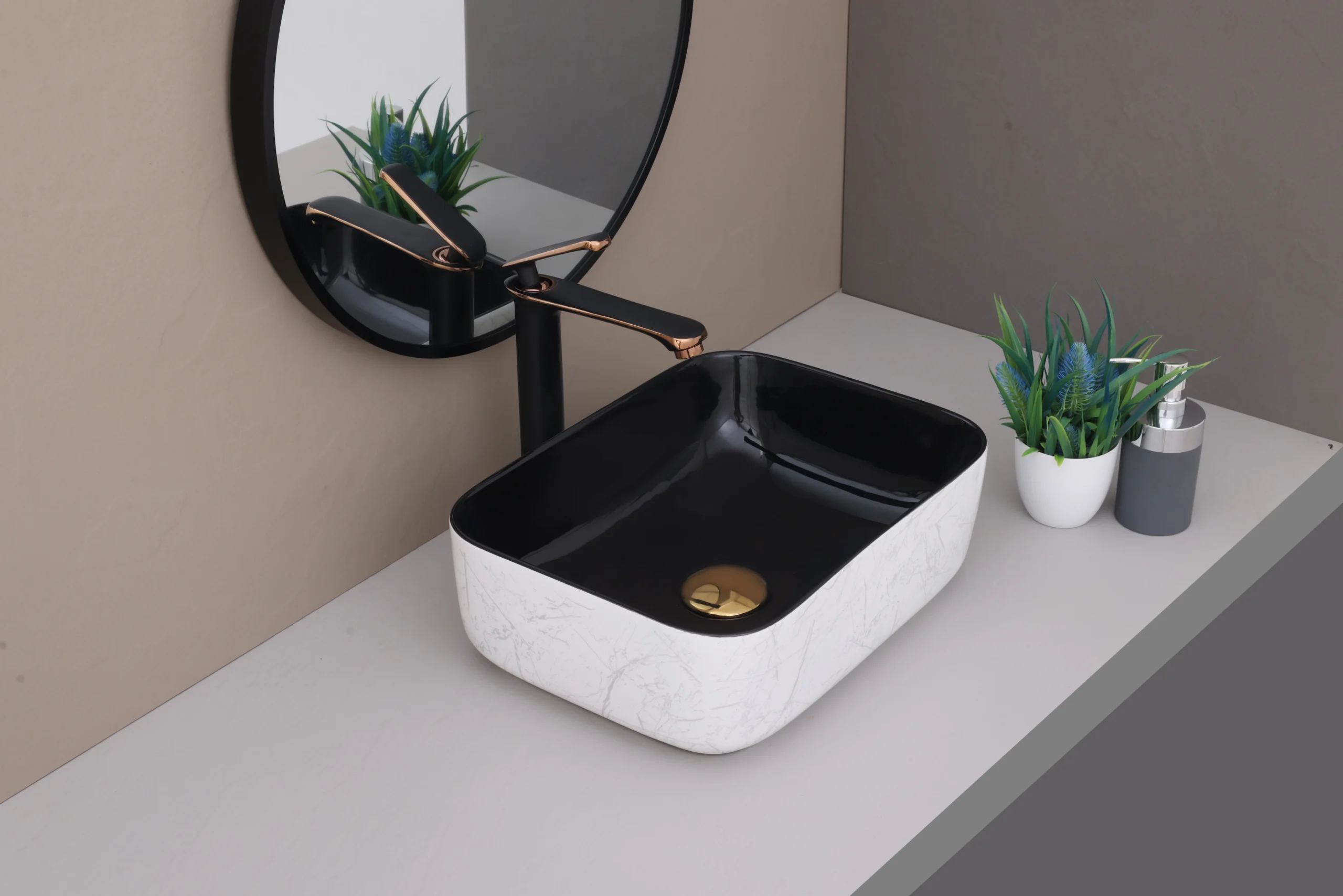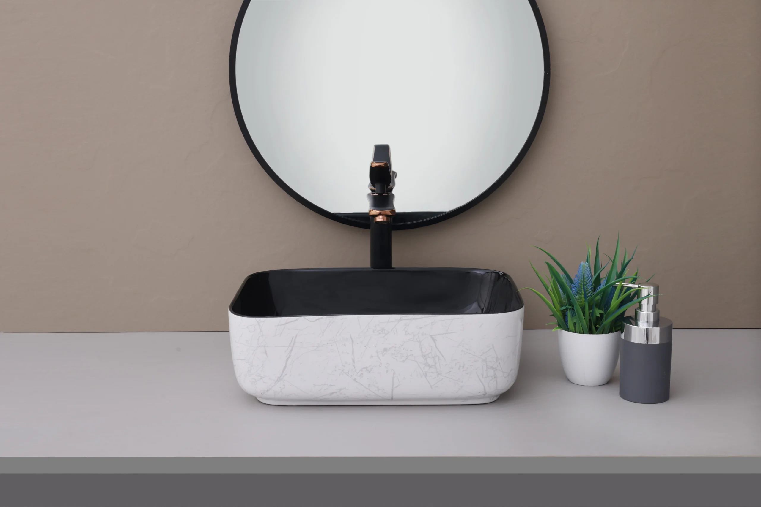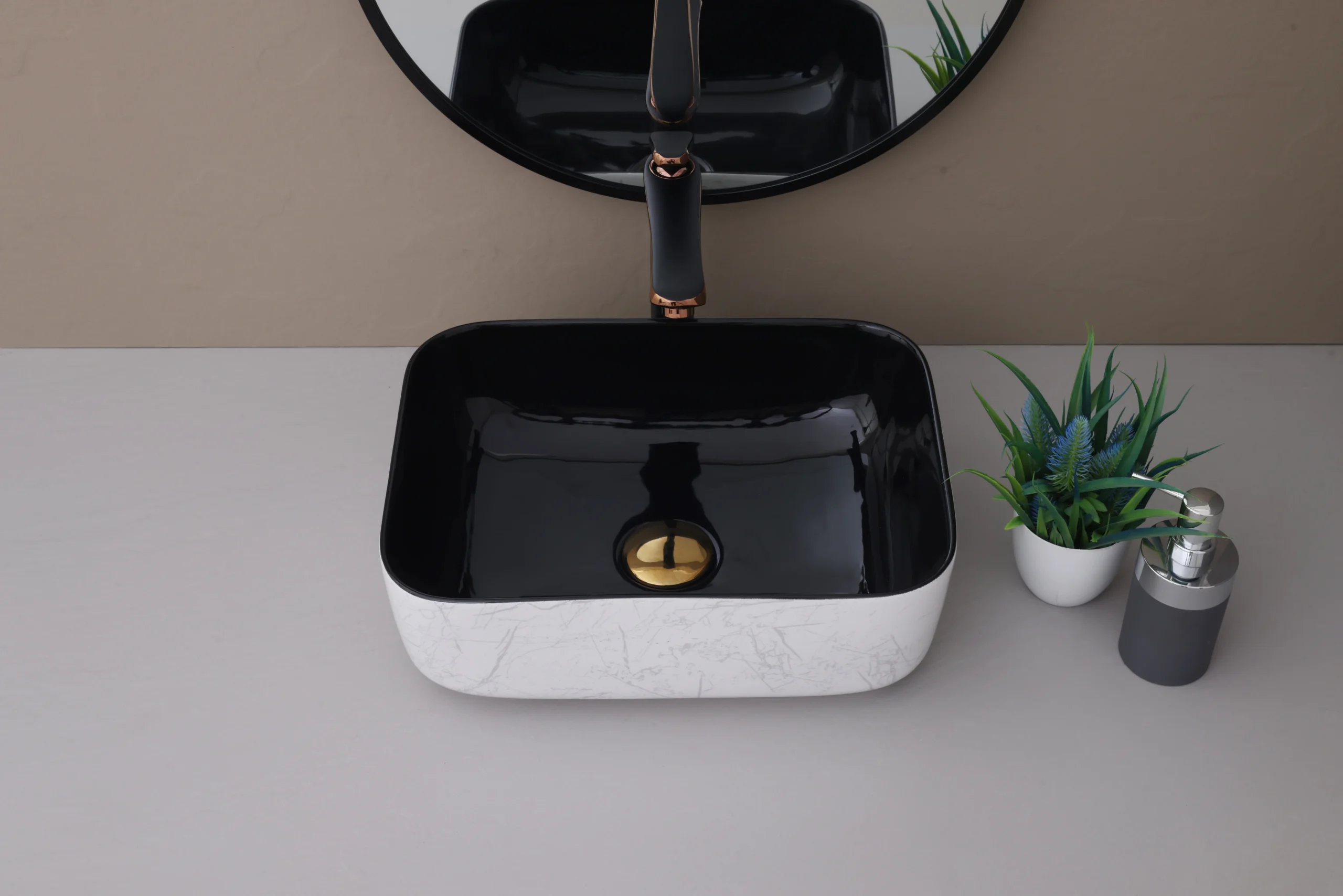 This elegant rectangular vessel sink features a unique dual-tone design—glossy black interior paired with a white exterior finished in subtle marble-style veining.
