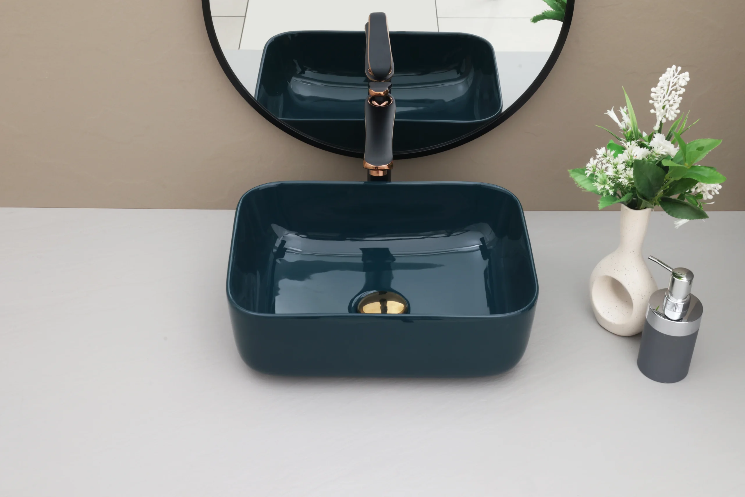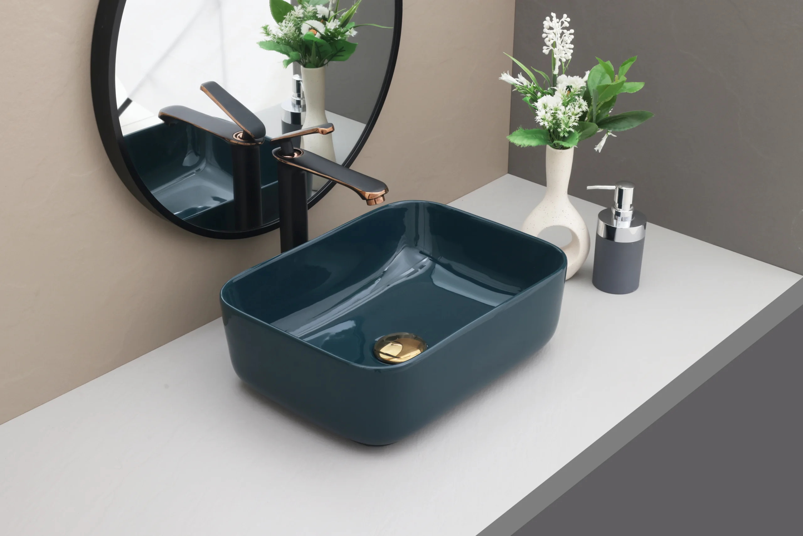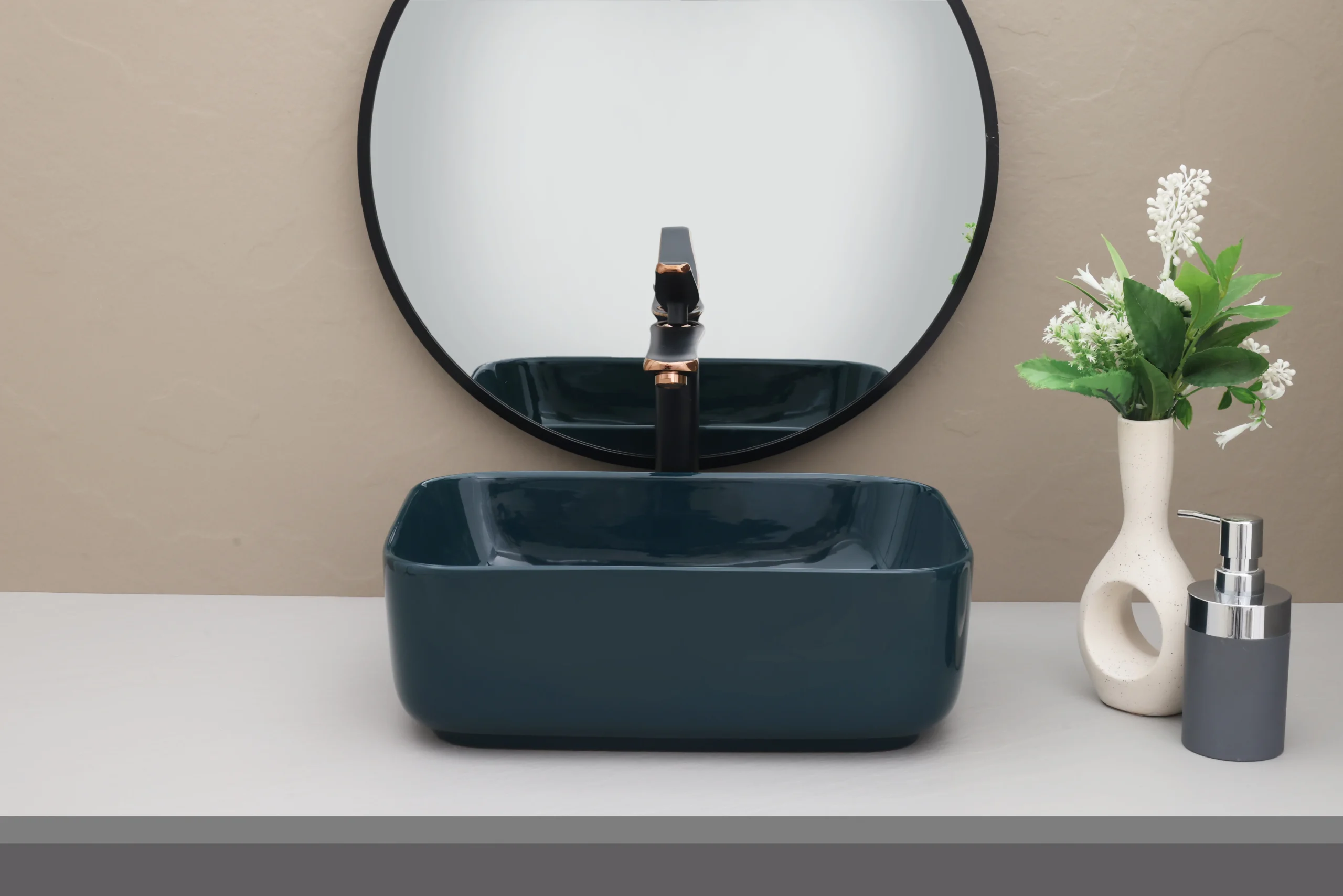 The peacock blue ceramic vessel sink is a showstopper, offering a rich jewel-toned elegance that transforms a standard bathroom into a high-end designer space.