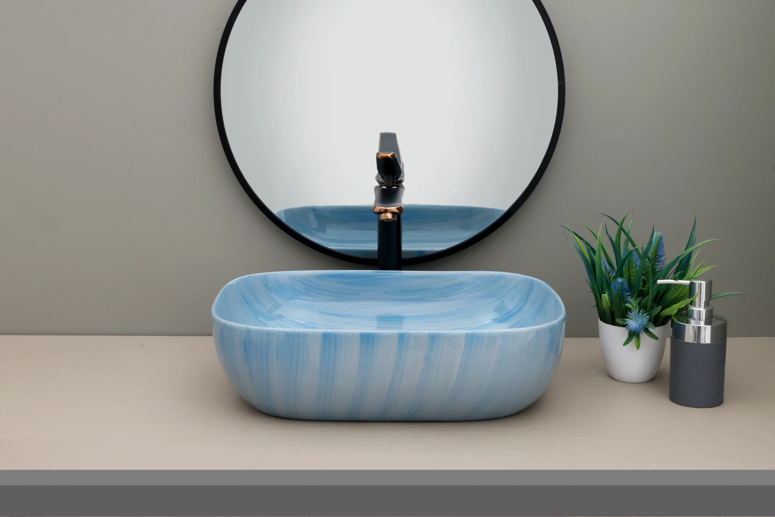 This elegant, sky-blue marbled washbasin offers a refreshing, coastal-inspired aesthetic for any modern bathroom.