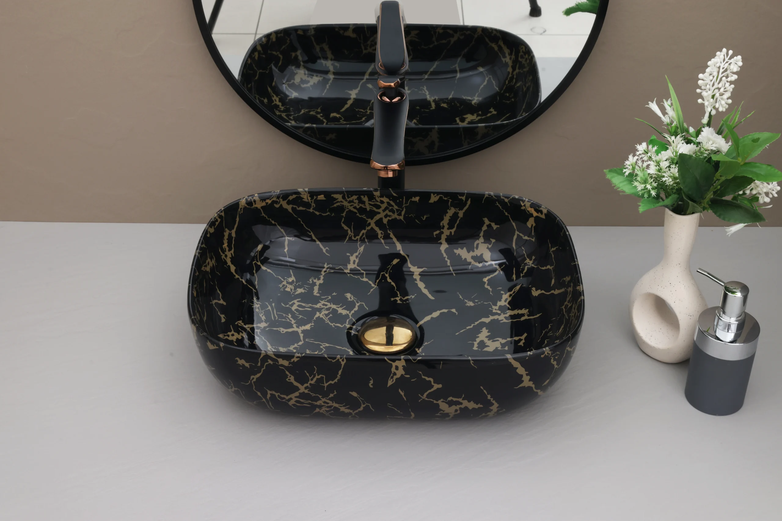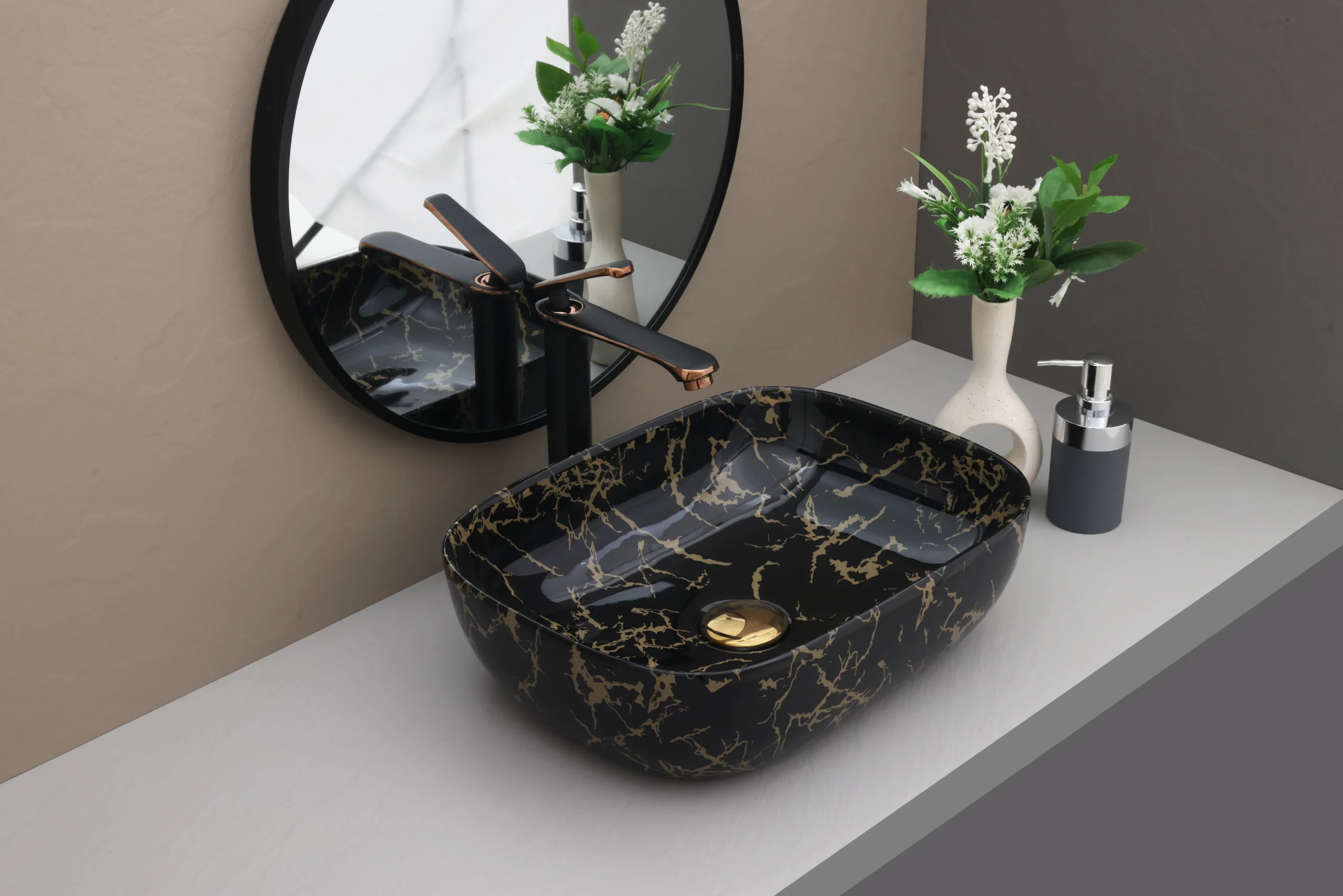 A high-gloss black finish adorned with intricate gold marbling for a five star hotel feel at home.
