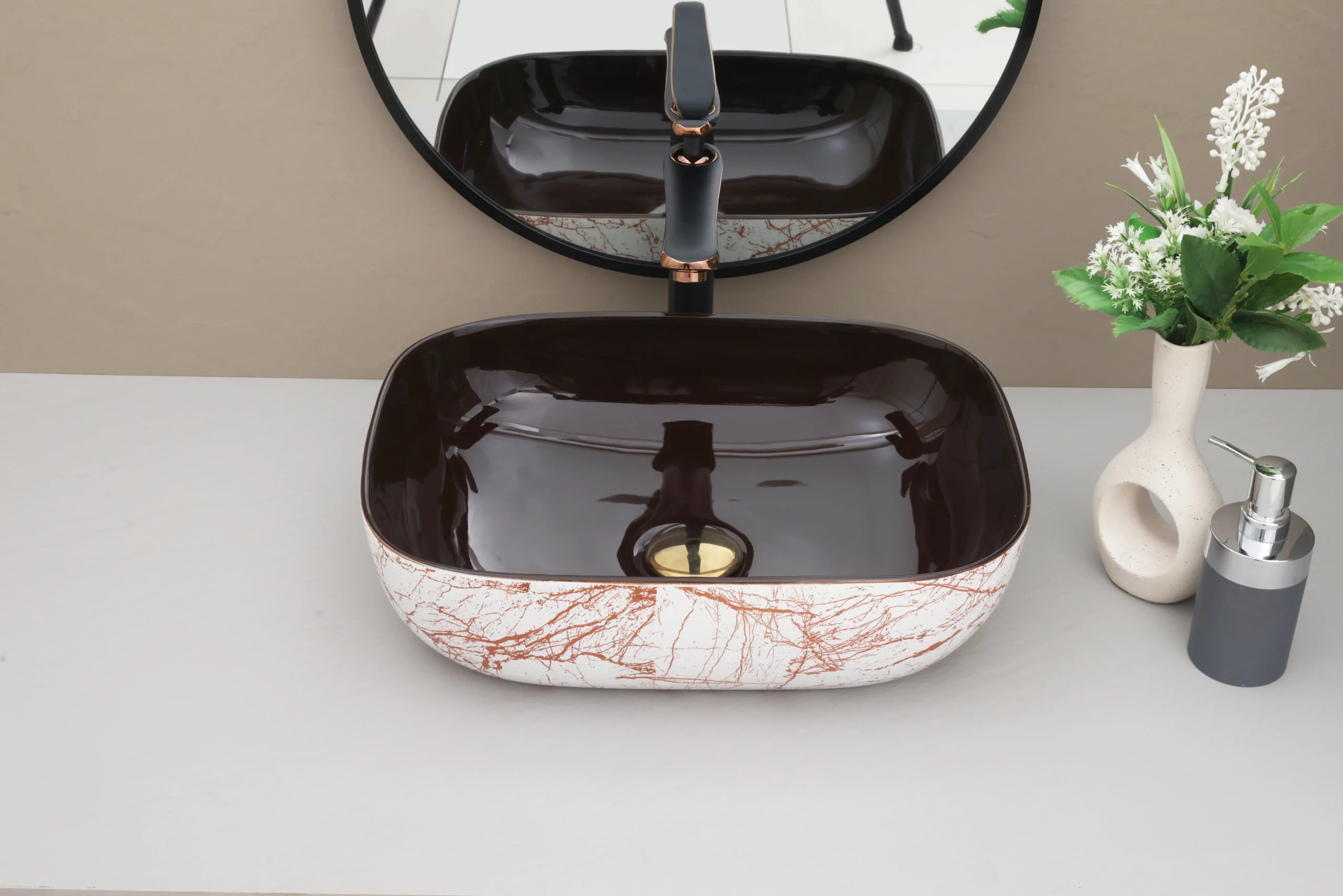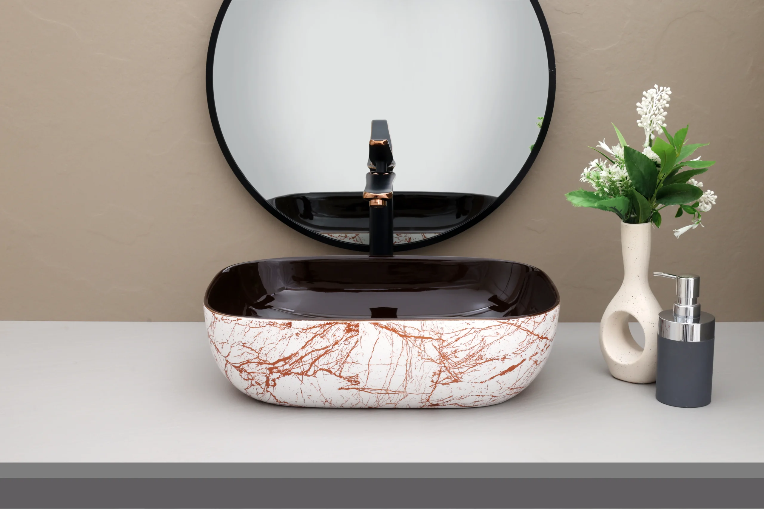A high-gloss black finish adorned with intricate gold marbling for a five star hotel feel at home.