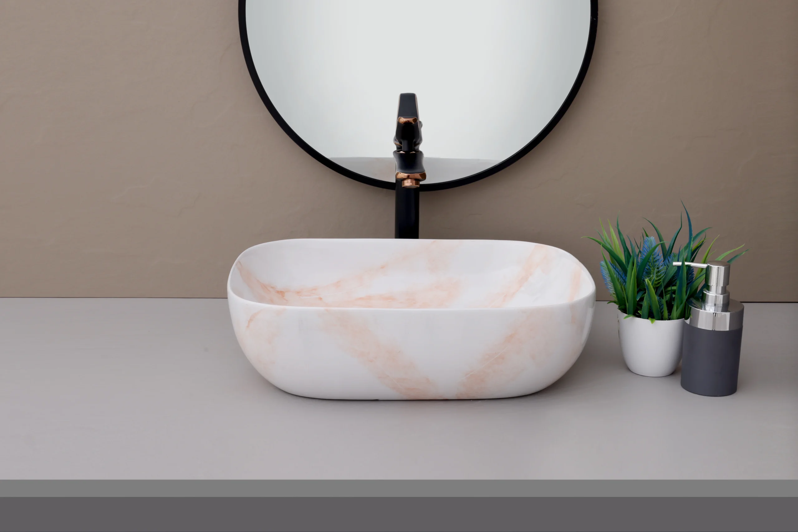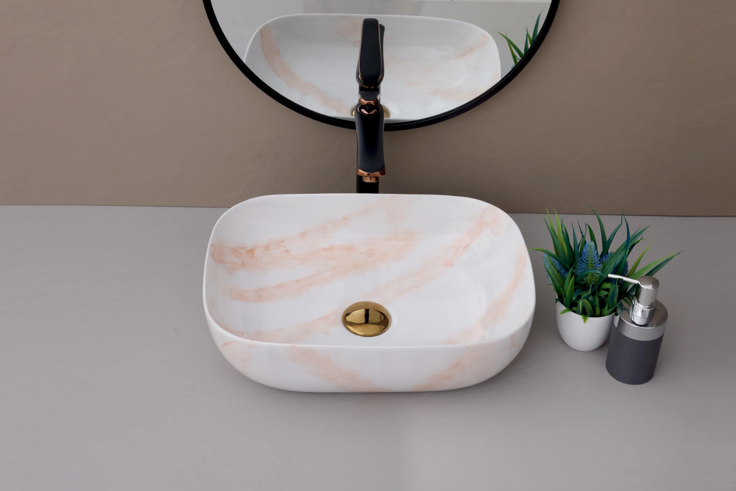 Elevate your bathroom aesthetic with this exquisite vessel-mounted washbasin.