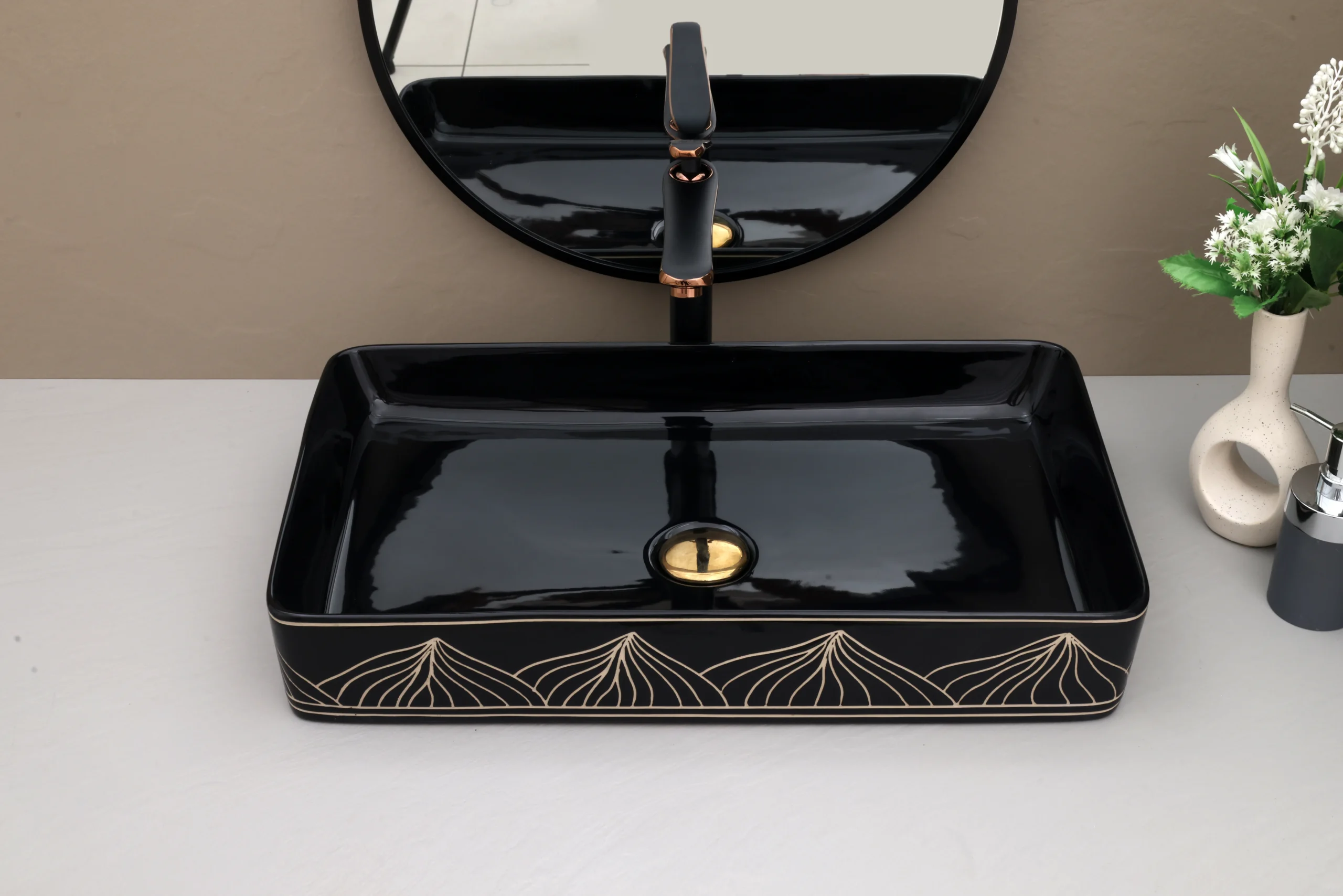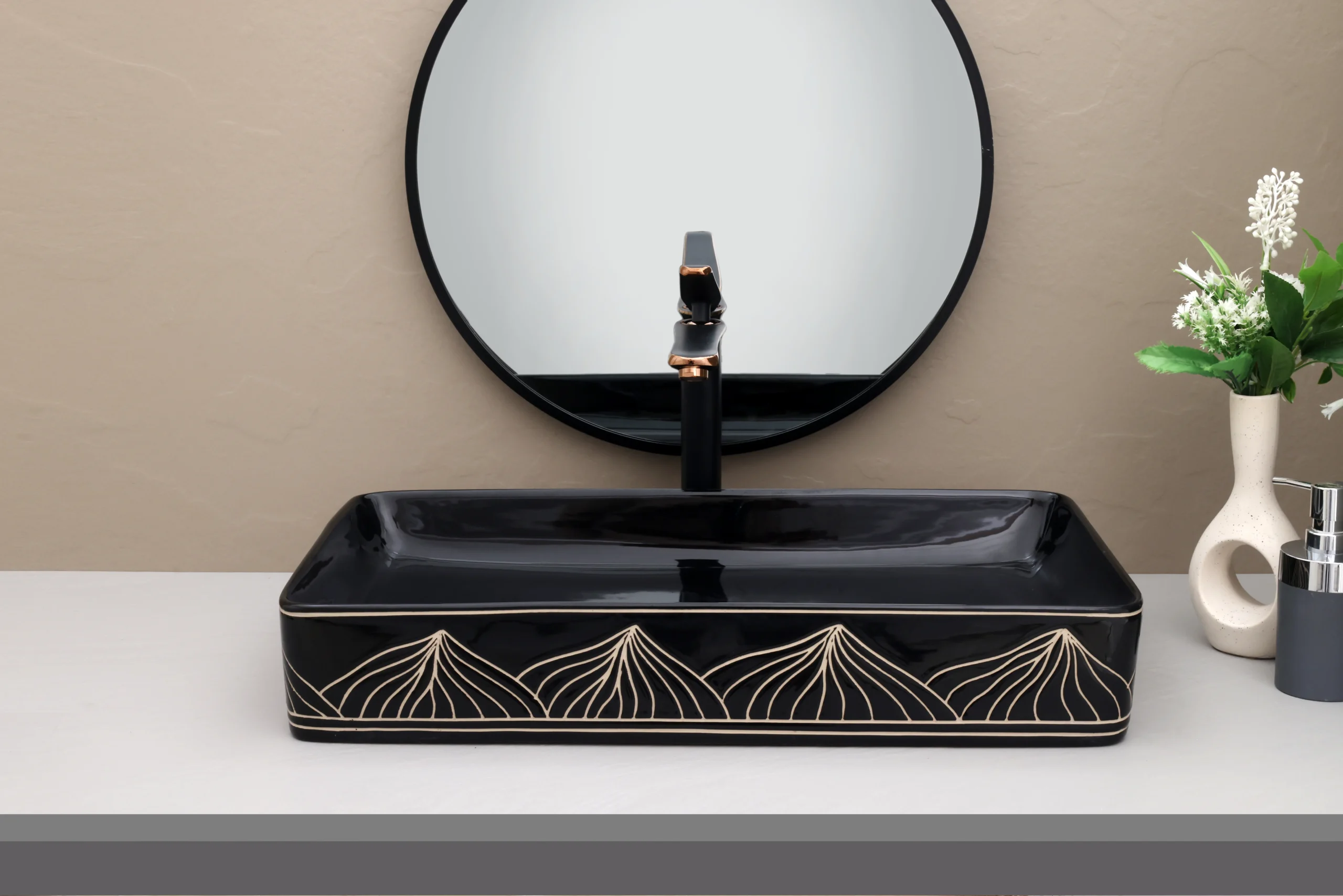 The designer-patterned exterior paired with a glossy black interior create a unique, designer look.